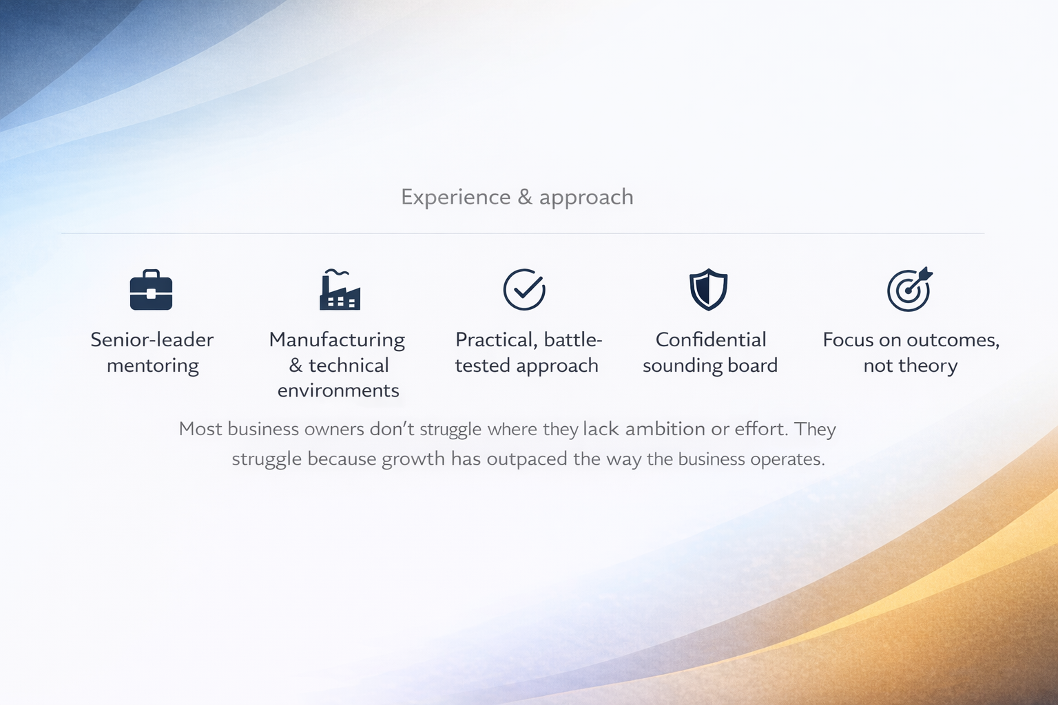 Running a business often means carrying decisions alone. A confidential sounding board provides a safe, independent space to talk through challenges, test ideas, and make better decisions without internal politics or second-guessing. This is not coaching or consultancy — it’s practical, experience-led challenge from someone who understands the realities of leadership and operations. The result is clearer thinking, reduced pressure, and more confident leadership.